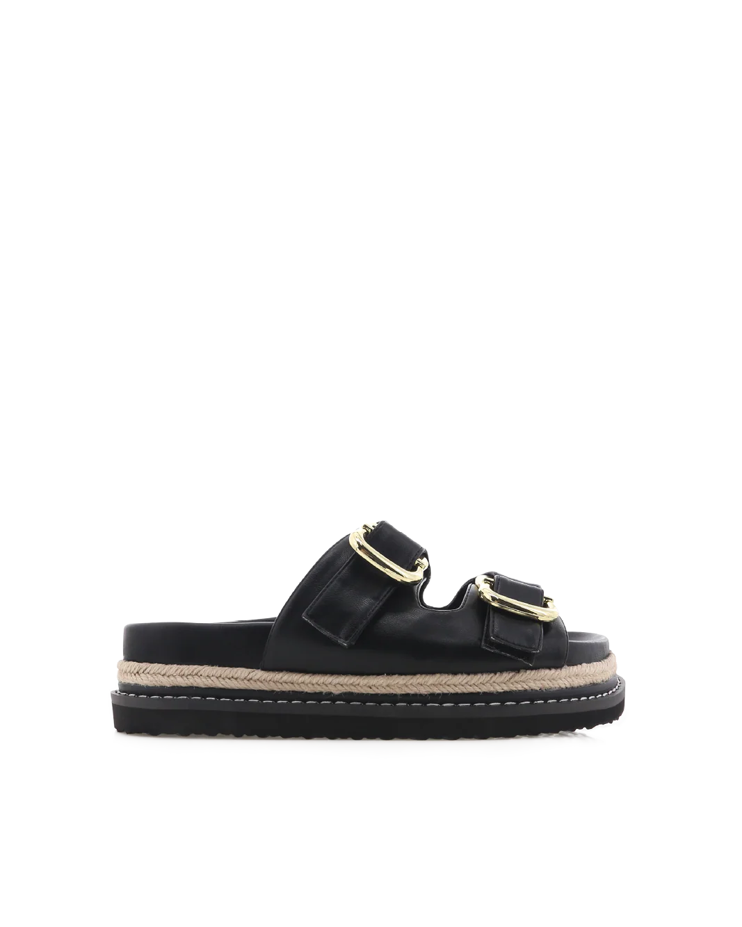 This Chunky sandal features a bold silhouette with twin gold buckle detailing, combining modern edge with an effortless feel.